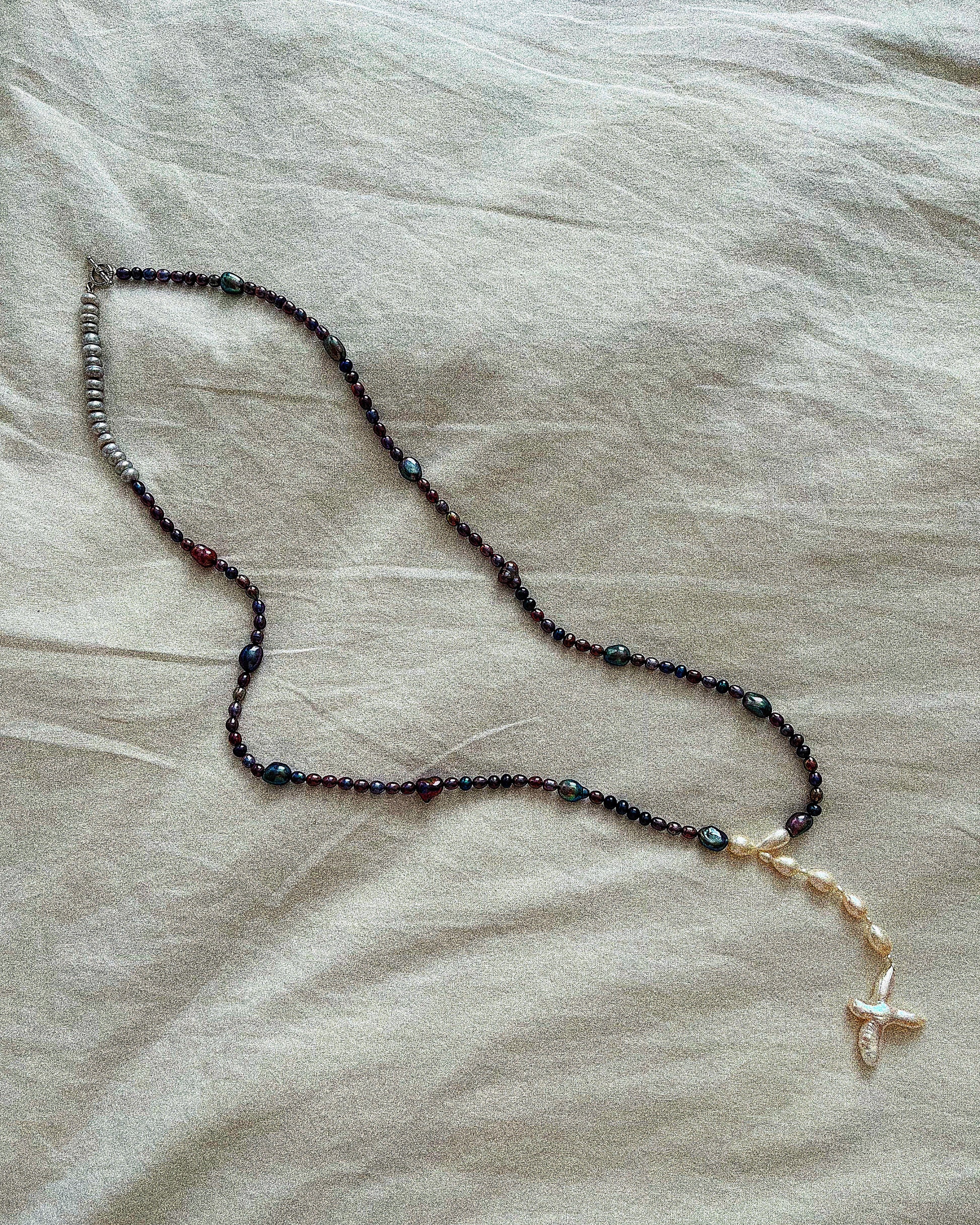 22 Inches long and ultra sexy. This piece is composed of twilight pearls, baroque white pearls from Japan and tear drop pearls and finished with sterling silver clasps.