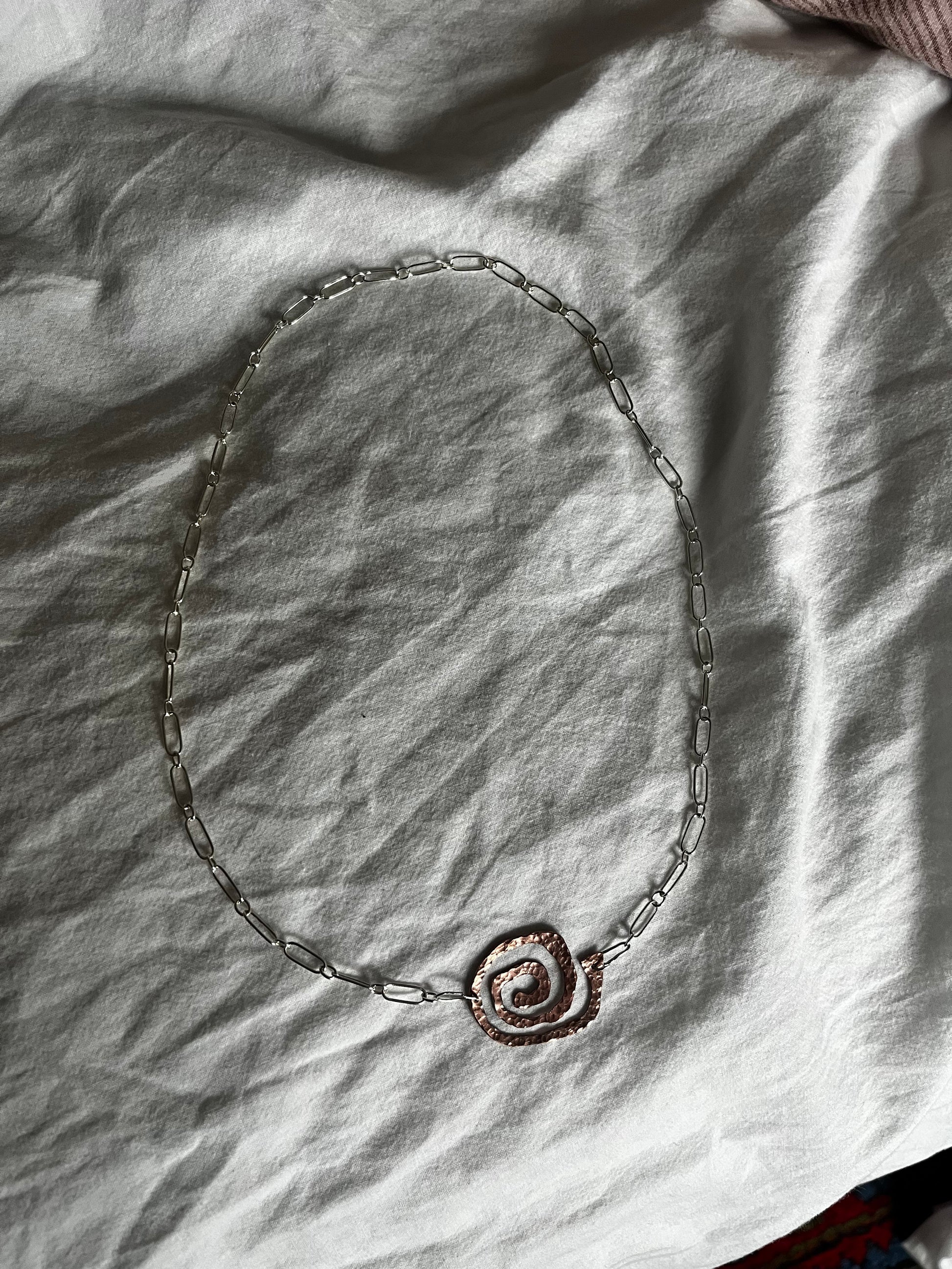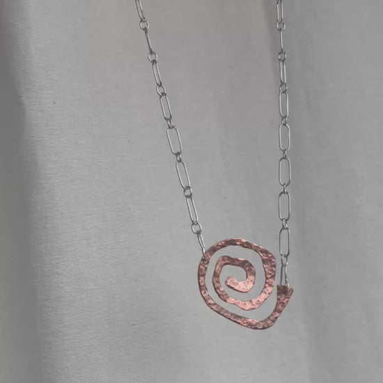 A nautilus is is an ancient marine mollusc of the cephalopod family. Made of hammered and cut copper, this mollusc pendant hits the centre of the chest and hangs by 925 sterling silver chain.